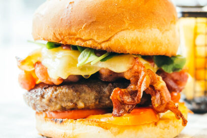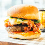 Rinderhack | Brioch | Römersalat | Käse | Tomate | rote Zwiebeln | Gewürzgurken